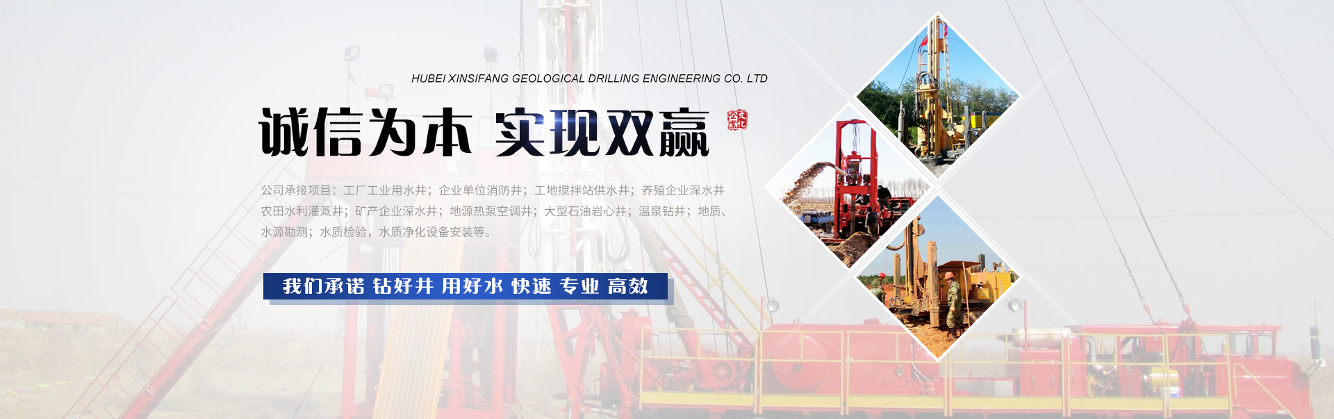 湖北鑫四方地质钻井工程有限公司是一家资质齐全、注册资金为600万的正规钻探企业。多年来公司以良好的企业信誉、优质的钻井服务、多年的施工经验、专家的长期合作、先进的钻井设备、超高的成井几率、合理的工程价格成为国内钻井行业的品牌企业。湖北鑫四方地质钻井工程有限公司秉承着“创全国名牌、做知名企业”、“不当跟随者,争做领跑者”的精神,服务于每一位客户、钻好每一口深井,因此与湖北、湖南、贵州、江西、重庆等各大省市的大型企业建立了长期合作关系。 湖北鑫四方地质钻井工程有限公司拥有先进的钻探设备。2天即可完成一口深水井,是目前钻探行业中快速钻井公司里的佼佼者。公司现拥有岩心机、空气机、潜孔钻机、水源钻机、磨盘机、石油钻机等多种类型钻机。可承接3000米以内深井施工、大口径水井施工项目。公司承接项目: 1,工厂工业用水井;企业单位消防井;工地搅拌站供水井; 2,养殖企业深水井;农田水利灌溉井;矿产企业深水井; 3,地源热泵空调井;大型石油岩心井;温泉钻井; 4,地质、水源勘测;水质检验,水质净化设备安装。 我们以“诚信为本,实现双赢”作为企业核心精神。我们深知钻好一口深井,客户将取之不尽,用之不竭。这不仅仅解决了客户的用水问题,又为客户节省了大量的自来水费以及排污费。从而给客户带来多重效益,达到一次投资长期受益的效果。我们始终坚信今天的优质服务,明天的良好市场。竭诚欢迎各位新老顾客前来咨询合作。